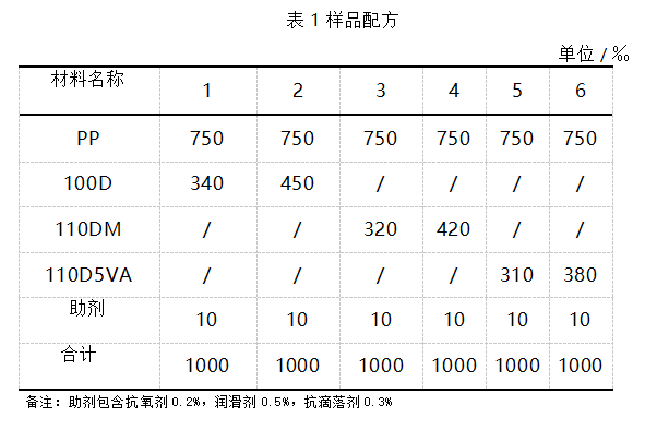 将实验所用PP以90℃条件干燥3h。将干燥后的PP、阻燃剂及各种助剂根据配方搅拌均匀混合后,加入到双螺杆挤出机中挤出,造粒,干燥。根据测试内容不同,注塑制成各种标准样条,样板。