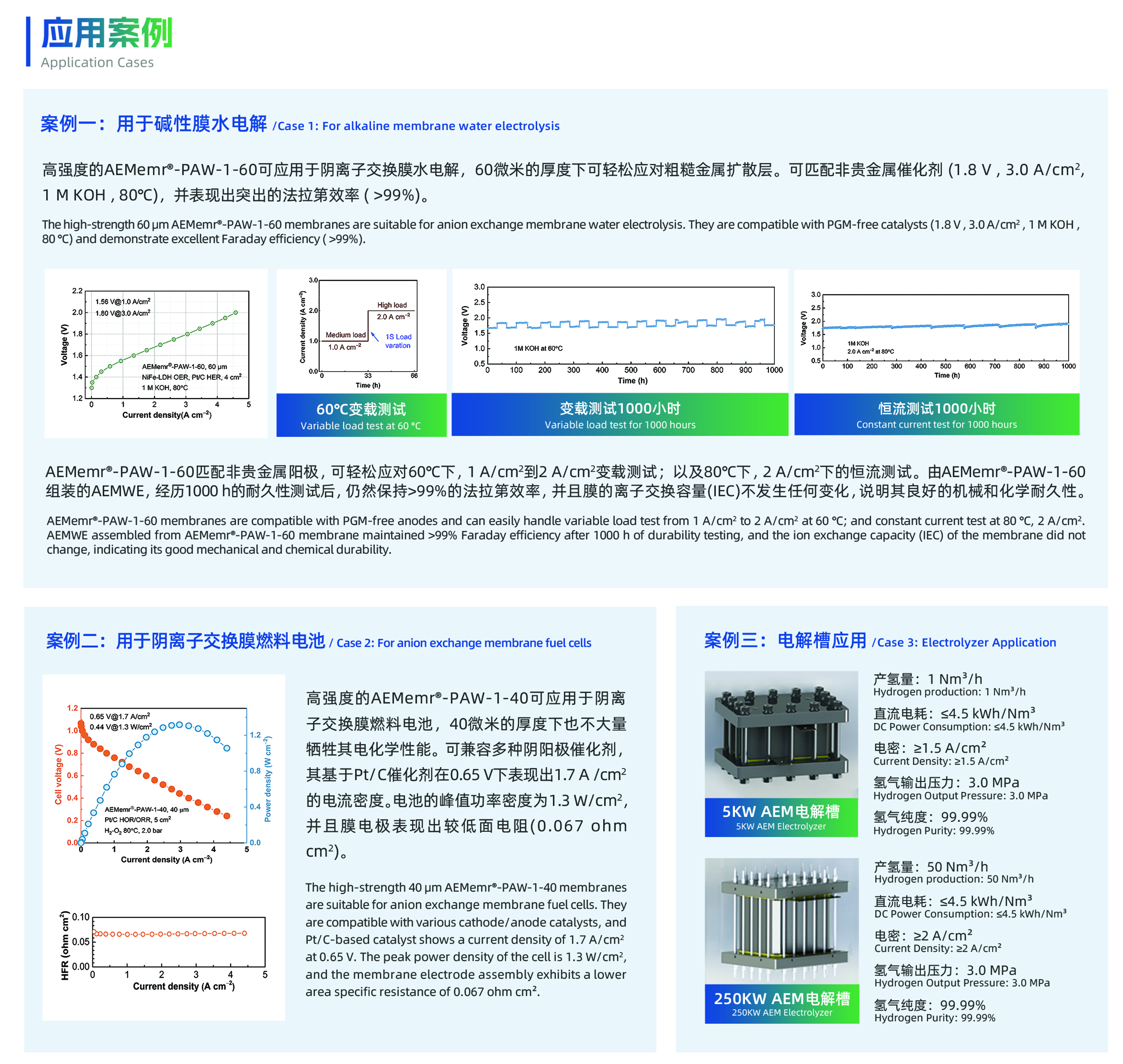 中国贝博氢友专注于阴离子交换膜的研发、生产与销售。其开发的AEMemr®系列产品已实现卷对卷连续生产,具有离子传导率高(180 mS/cm,OH¯形式,80°C)、碱稳定性高(10000+ h,1 M KOH,80°C)和机械强度高(50 MPa stress,>80% strain)等特点,可应用于水电解制氢、碱性膜燃料电池、液流电池、电化学合成氨以及水处理等多个领域。