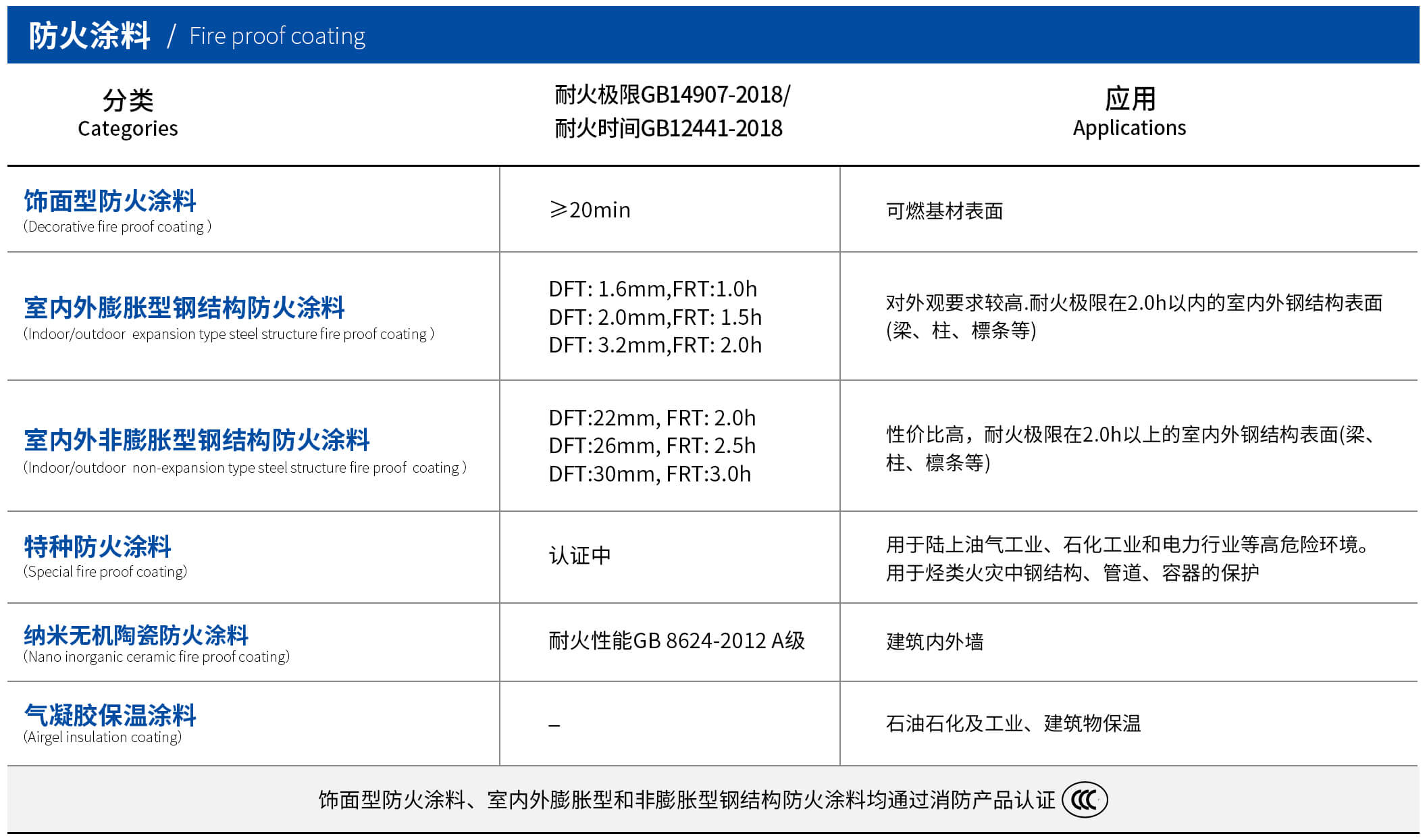 产品介绍:防火涂料是指涂装在物体表面,在火灾发生时,可阻止火势传播或隔离火源,延长基材着火时间并增加绝热性能以推迟结构破坏时间的一类特种涂料。本公司生产的产品包括室内外膨胀型防火涂料、室内外非膨胀型防火涂料、透明及白色饰面型防火涂料、无溶剂环氧型防火涂料等4大系列产品,被广泛用于机场、高铁站、博物馆、图书馆、会展中心及石化厂房、医院等项目工程中