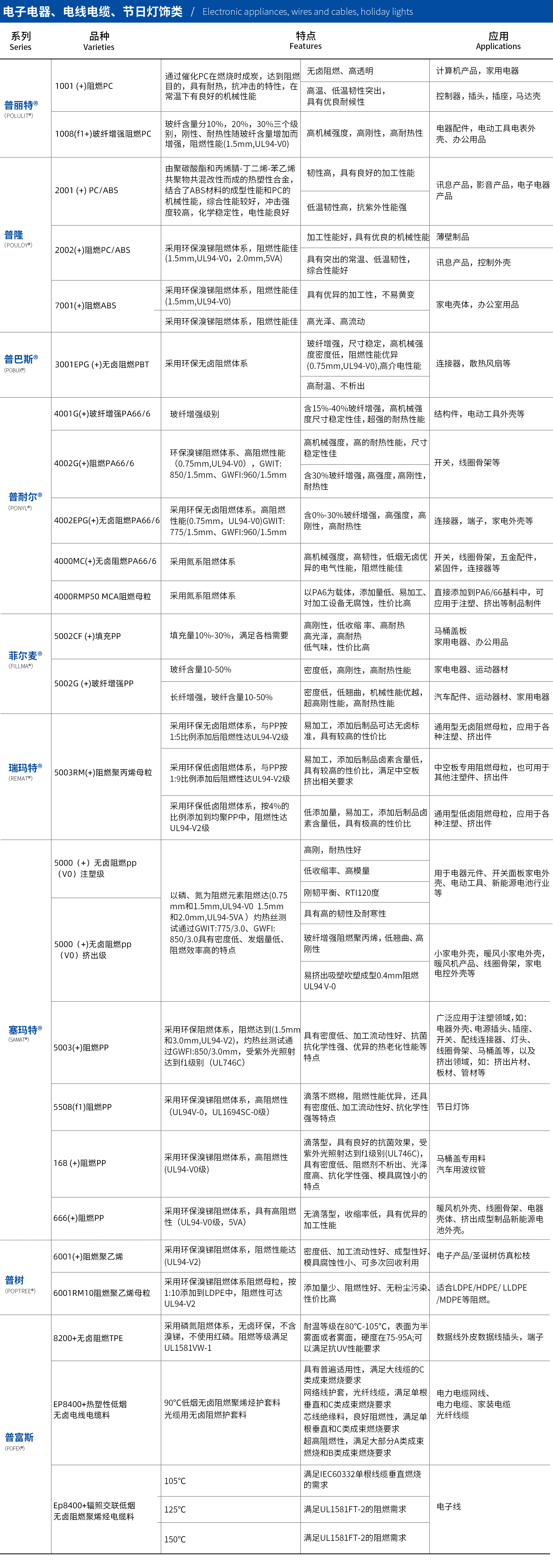产品介绍:阻燃性能达UL94V-0和VW-1级,符合RoHS、SVHC、17P、Halogen、PAHs等法规的要求。具有耐析出性强、优异的耐水解性、耐迁移性、电性能优越,环保的特性。